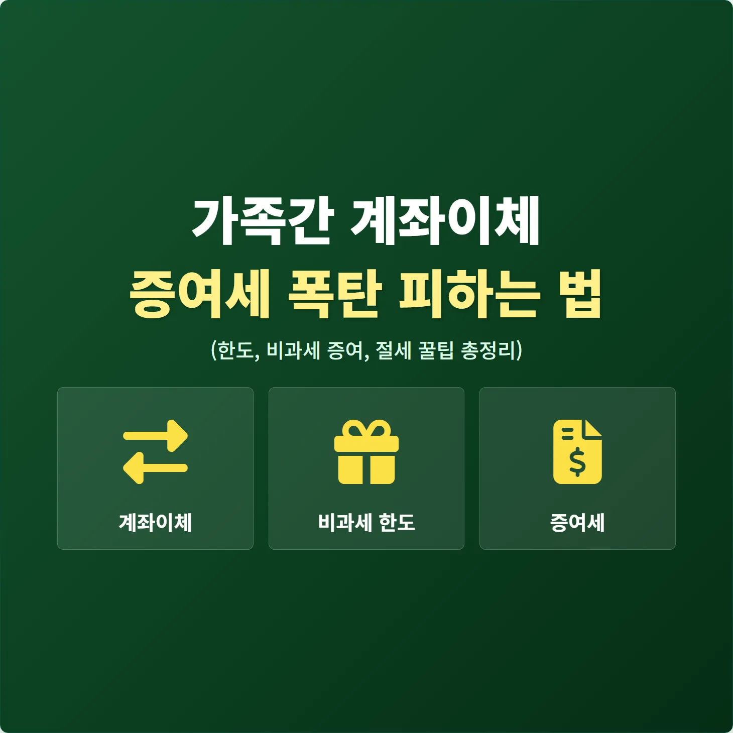 2025년 최신 가족간 계좌이체 증여세 정보를 총정리했습니다. 성인 자녀 5천만 원, 배우자 6억 원 등 10년간 비과세 한도와, 신설된 혼인·출산 1억 원 추가 공제 꿀팁, 그리고 증여세 없이 2억 원까지 빌려주는 방법까지! 세금 걱정 없이 안전하게 돈을 주고받는 모든 방법을 이 글 하나로 확실하게 알려드립니다.