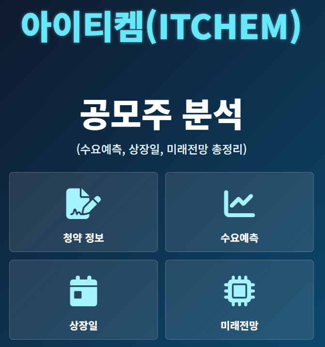 2025년 하반기 공모주 시장의 열기를 주도한 정밀화학 소재 기업 아이티켐(309710)이 성공적으로 코스닥 시장에 입성했습니다. 기관과 개인 투자자들의 폭발적인 관심 속에 '완판' 기록을 세우고, 상장 첫날부터 높은 주가 상승률을 보여주었는데요. 이 글에서는 아이티켐이 어떤 회사인지, 왜 이렇게 뜨거운 관심을 받았는지, 그리고 앞으로의 미래 전망은 어떨지 알기 쉽게 정리해 보겠습니다.