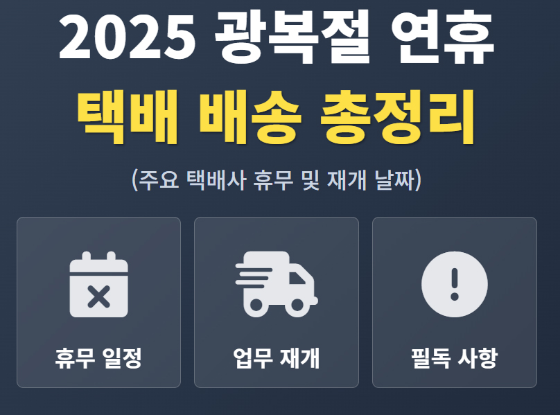 2025년 광복절 연휴 택배 대란을 피하기 위한 필수 정보를 총정리했습니다. 올해 '택배 없는 날'은 택배사별로 달라 꼭 확인이 필요합니다. CJ대한통운, 한진, 롯데, 로젠, 우체국 택배의 정확한 휴무일과 업무 재개 날짜, 그리고 쿠팡, SSG닷컴, 편의점 택배 등 정상 운영하는 곳의 정보까지 이 글 하나로 완벽하게 알려드립니다.