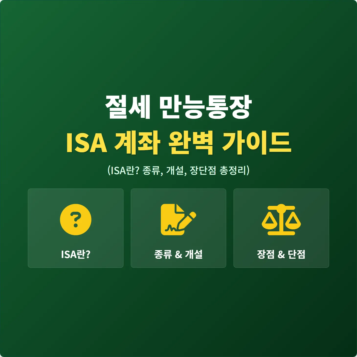 '만능 절세 통장'으로 불리는 ISA 계좌의 모든 것을 총정리했습니다. ISA 계좌란 무엇인지, 가장 큰 장점인 '손익통산'과 비과세 혜택, 그리고 투자 성향에 맞는 3가지 종류(중개형, 신탁형, 일임형)의 장단점과 비대면 개설 방법까지! 이 글 하나로 2024년과 2025년 ISA 계좌의 모든 것을 완벽하게 이해할 수 있습니다.
